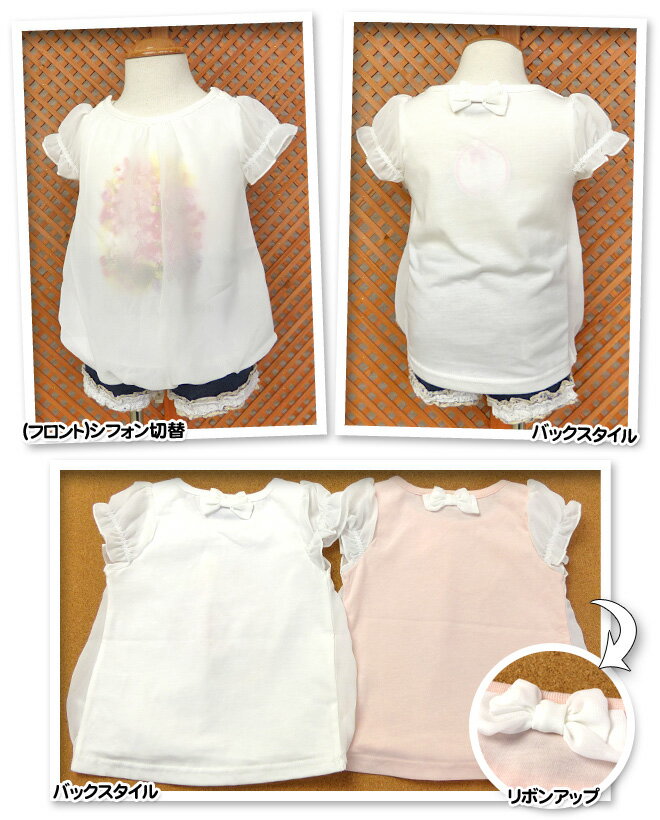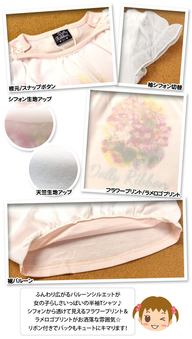 【送料無料】ベビー服 女の子 Tシャツ 半袖 Dolly Ribbon ドーリーリボン シフォン切替 天竺生地 裾バルーン フラワープリント スナップボタン 女児 ベビー 90cm 95cm【メール便対応】