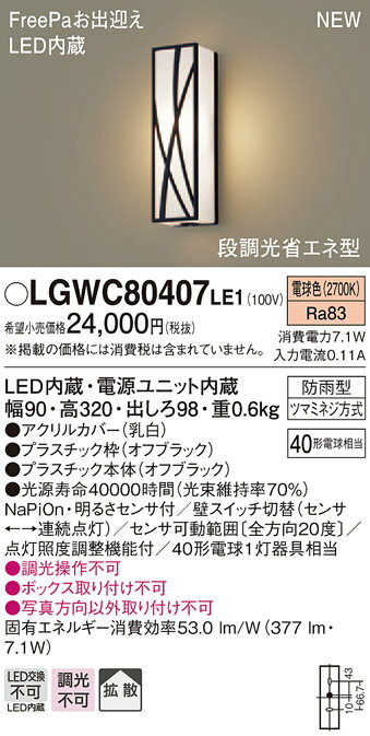 商 品 詳 細商品名パナソニック エクステリアライトメーカー名パナソニック Panasonicメーカー器具名称エクステリアライト ブラケットライト ポーチライト(玄関廻り)仕様◆LED(電球色タイプ) ◆光源色温度:2700 K ◆光源寿命40000時間(光束維持率70%)◆幅:90 mm ◆高:320 mm ◆出しろ:98 mm ◆質量:0.6 kg◆器具光束:377 lm ◆電圧:100 V ◆消費電力:7.1 W ◆消費効率:53 lm/W◆デザイン分類:Natural◆【アクリルカバー】乳白◆【プラスチック枠】オフブラック◆【プラスチック本体】オフブラック◆Ra83◆NaPiOn・明るさセンサ付◆壁スイッチ切替(センサ←→連続点灯)◆センサ可動範囲〔全方向20度〕◆点灯照度調整機能付◆40形電球1灯器具相当◆入力電流(100V時):0.11 A◆調光操作不可◆ボックス取り付け不可◆写真方向以外取り付け不可注意事項◆写真方向以外取り付け不可 ※施工・電気工事は専門業者にご依頼ください。