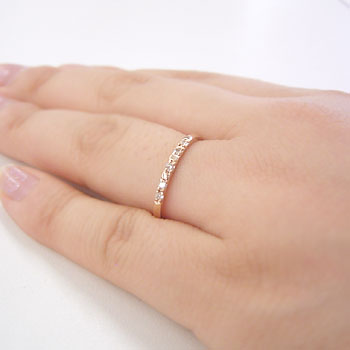 )大人の上質エレガンス・・!ダイヤモンド×ピンクゴールドリング・クラリオン上品で洗練された、大人の輝き・・「マリッジリングと重ねづけしたい!」「毎日使えるリングがほしい!」というたくさんのリクエストにおこたえして、シンプルでも上品なダイヤモンドリングをおつくりしました!ほっそりしたアームの上に5ピース、合計0.09カラットのダイヤモンドがキラキラ・・ピュアで繊細な光をはなちます!肌なじみのいいピンクゴールドの輝きと、美しい細身のシルエットがフェミニン・・!ダイヤモンドのピュアな輝きをひきたてて嫌味のない女らしさをひきだしてくれますよ。